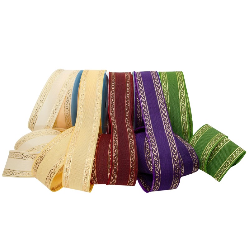 WSTĄŻKA LNIANA Z BROKATEM ZE WZOREM "ORNAMENT" 4cm, 6cm, 8cm/10m